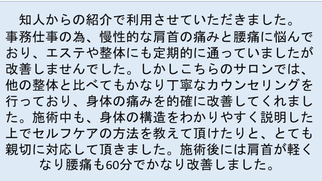 子供と一緒に行きましたが丁寧な接客で安心して施術を受けれました